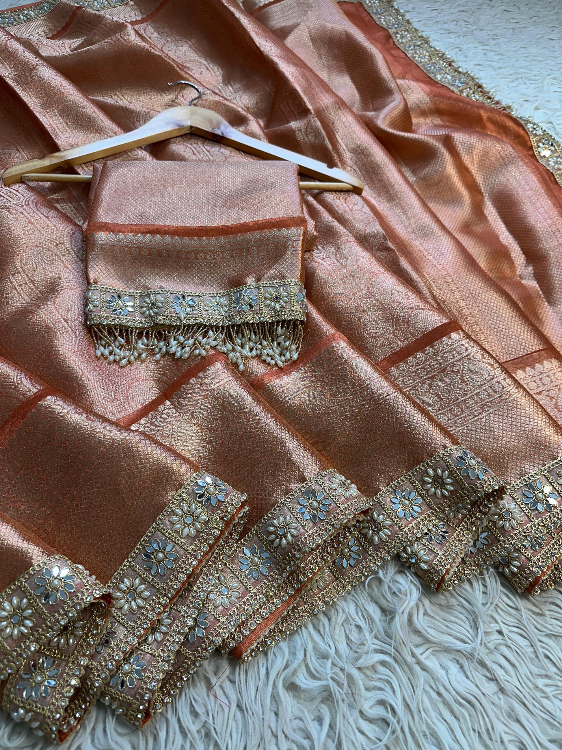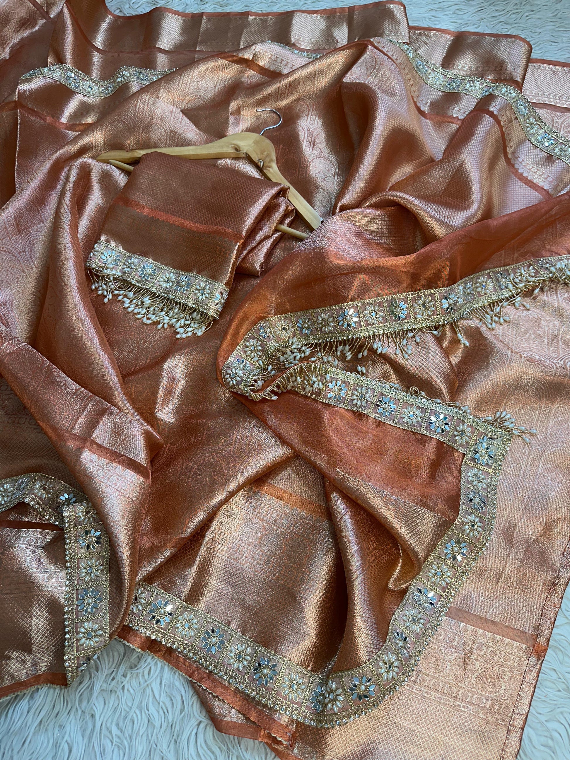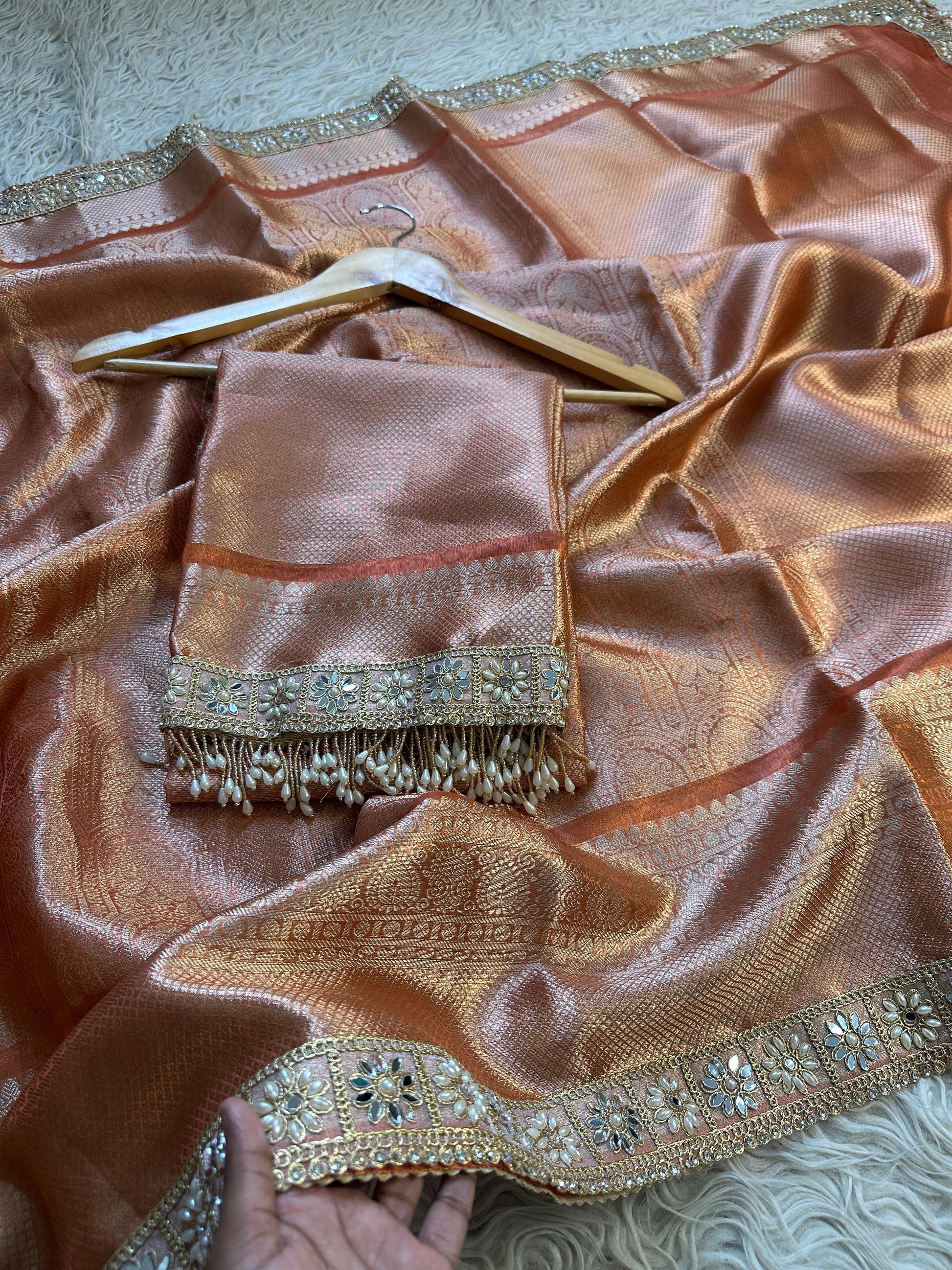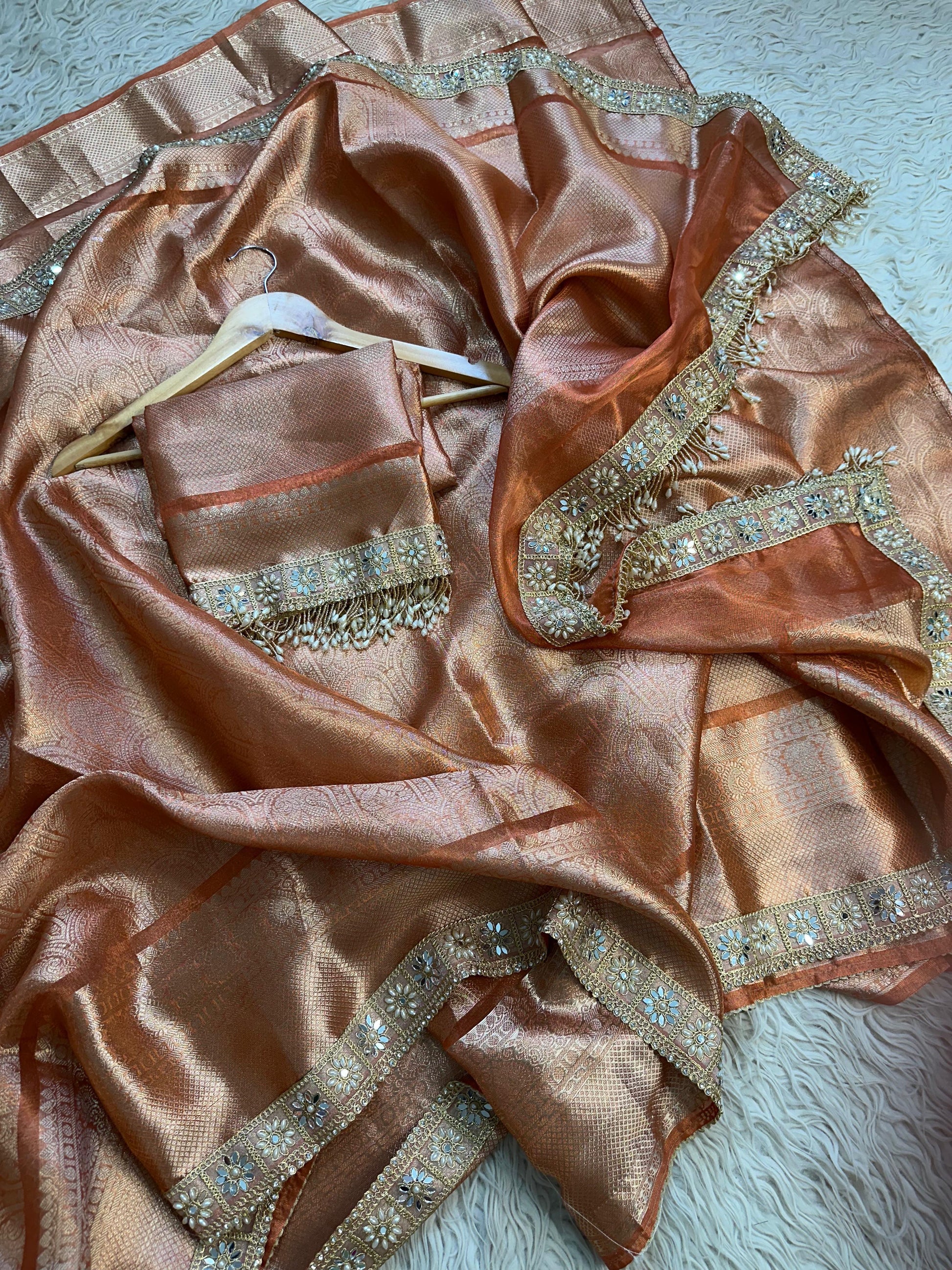 The Ivory Gold Elegance Saree features premium Banarasi brocade craftsmanship, characterized by intricate gold zari weaving and a stunning Moti lace border. Its rich jacquard jhalar pallu adds depth, while the included running blouse piece ensures a complete ensemble. Ideal for formal occasions, it combines traditional artistry with modern elegance.