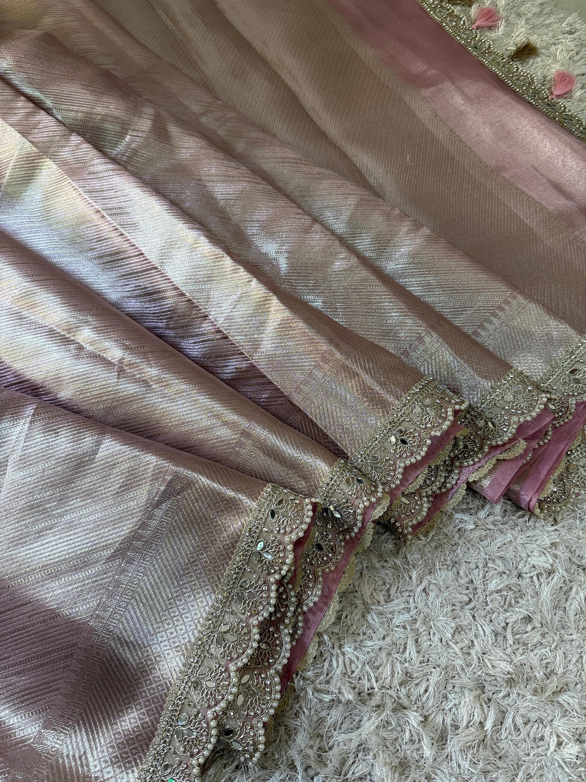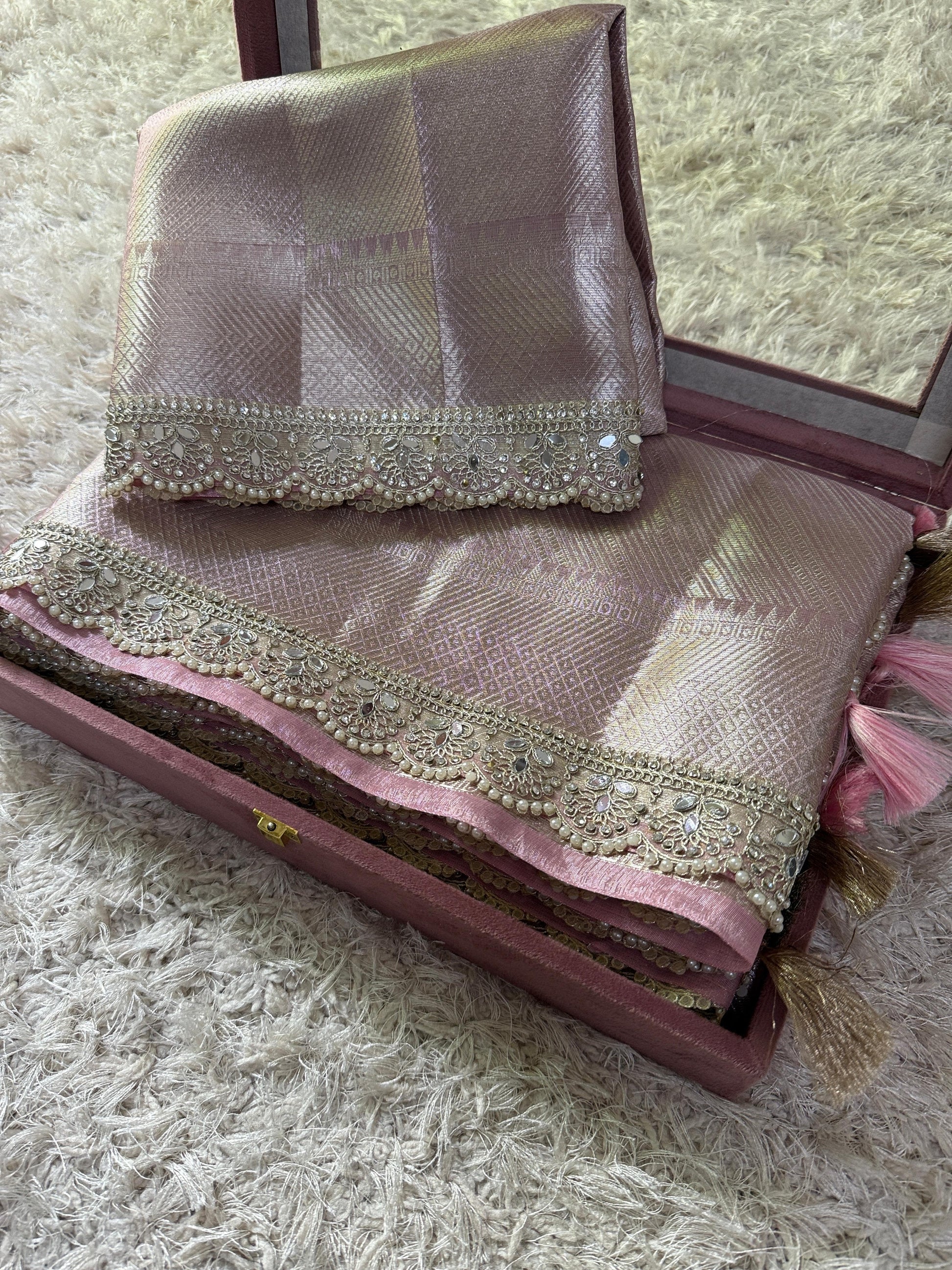 The Meher Aasmaani Saree is an exclusive Kanjivaram bridal Waskat Banarasi tissue silk saree, featuring a handcrafted diamond and pearls lace border and a tassel pallu. Its brocade pallu and blouse, along with a designer brocade body, offer a sophisticated aesthetic ideal for special occasions. Limited stock available.