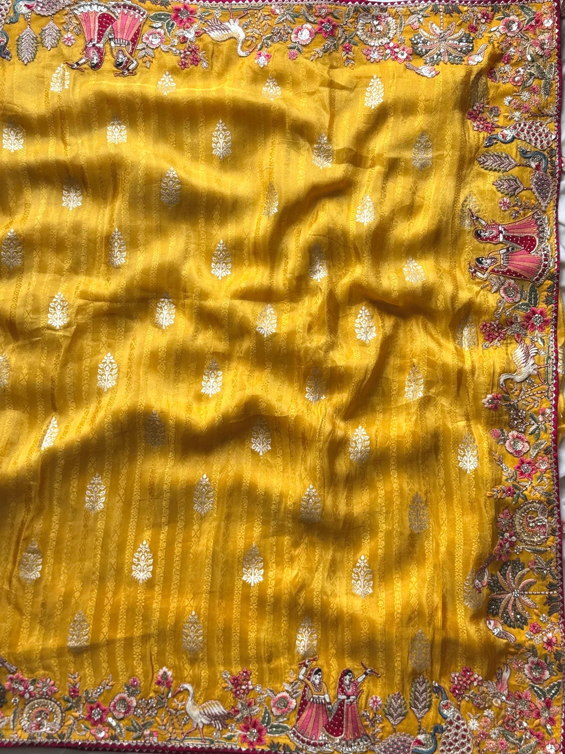 The Rani Mahal Silk Saree is crafted from premium Dola silk, featuring intricate coding work and a vibrant multi-color sequence throughout. Its scalloped coding sequence adorns both sides, while the designer tassels enhance its elegance. Accompanied by a fully sequined designer-stretched blouse, this saree offers a refined aesthetic ideal for formal occasions.