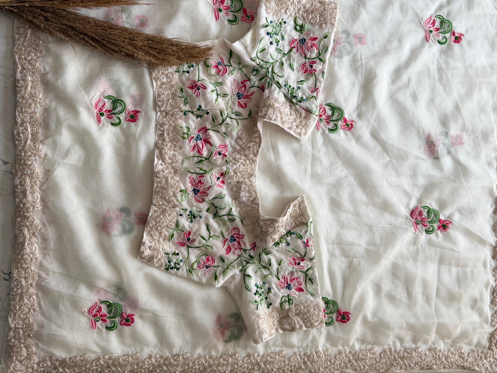 The Safed Saaz Saree features premium soft Tebby silk, enhanced with multi-color thread work and a codding scallop border. This designer piece offers an elegant look while ensuring comfort and durability. The accompanying unstiched fabric allows for customization, catering to diverse styling preferences.